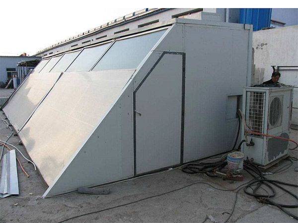熱泵助推式太陽能烤房主要由太陽能空氣集熱器、空氣源高溫?zé)岜谩⒅悄芑痉肯到y(tǒng)三部分組成。通過太陽能空氣集熱器對空氣進行加熱,利用循環(huán)風(fēng)機通過管道將高溫空氣傳輸?shù)娇痉吭诳痉績?nèi)通過太陽能空氣集熱器對   空氣進行加熱,利用循環(huán)風(fēng)機經(jīng)過管道將高溫空氣傳輸?shù)娇痉績?nèi);通過溫、濕度感應(yīng)器檢測,根據(jù)所測溫、濕度和干燥工藝,由智能化控制器控制空氣源熱泵的啟、停,排濕門的開、閉、實現(xiàn)全自動干燥。
