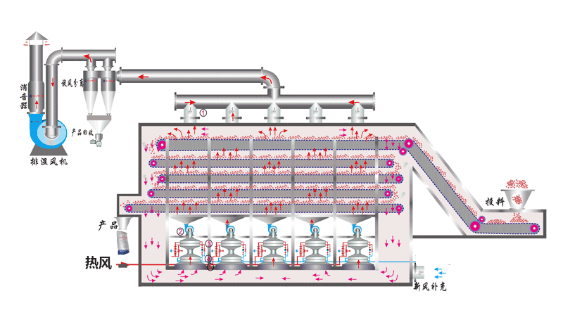 帶式干燥機(jī)主要由進(jìn)風(fēng)單元、排風(fēng)單元、循環(huán)風(fēng)單元、網(wǎng)帶、加熱系統(tǒng)、加料器、傳動(dòng)機(jī)構(gòu)、控制系統(tǒng)等部件組成。物料由撒布機(jī)均勻地鋪在網(wǎng)帶上,網(wǎng)帶采用12-60目不銹鋼(或碳鋼)絲網(wǎng),由傳動(dòng)裝置拖動(dòng)在干燥機(jī)內(nèi)移動(dòng),干燥段由若干單元組成,熱空氣通過(guò)風(fēng)機(jī)穿過(guò)物料層,完成熱量與物料的交換過(guò)程,含水量較大的氣體由排風(fēng)機(jī)排出。